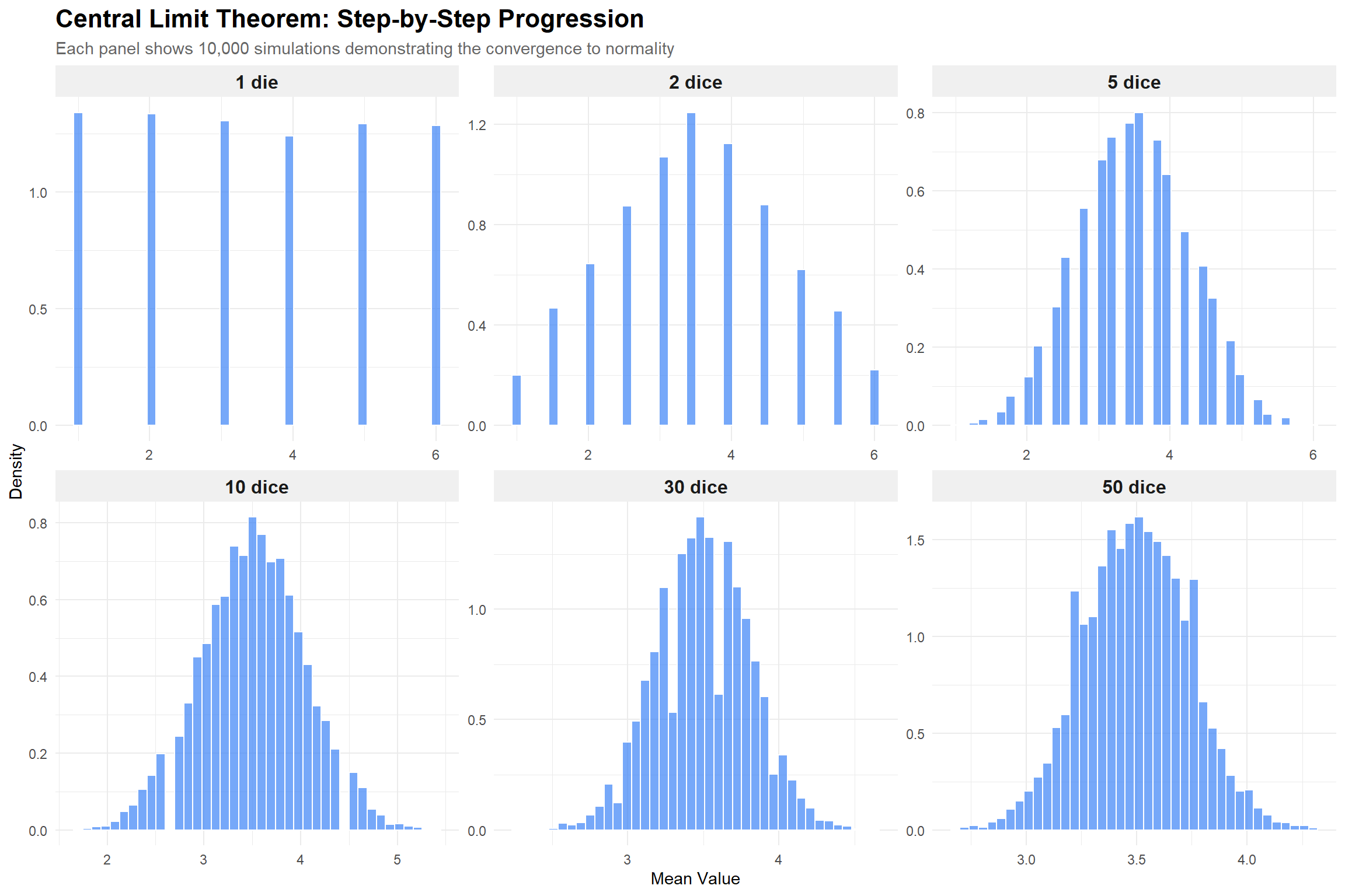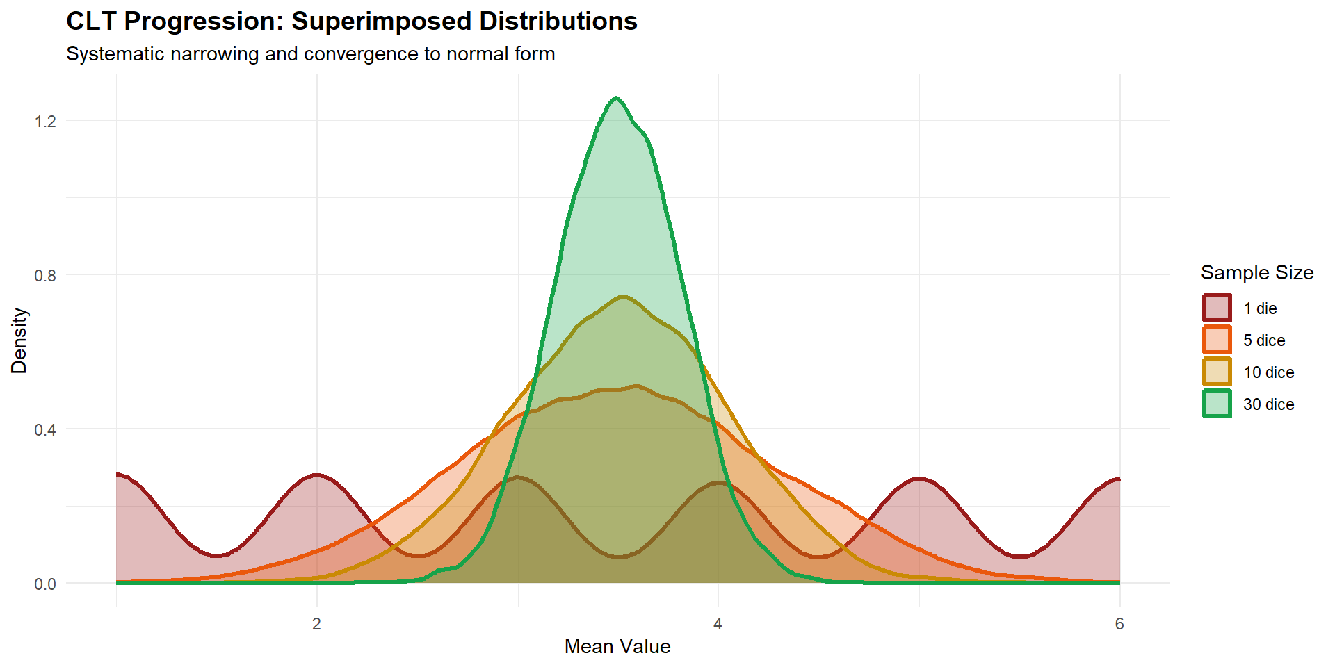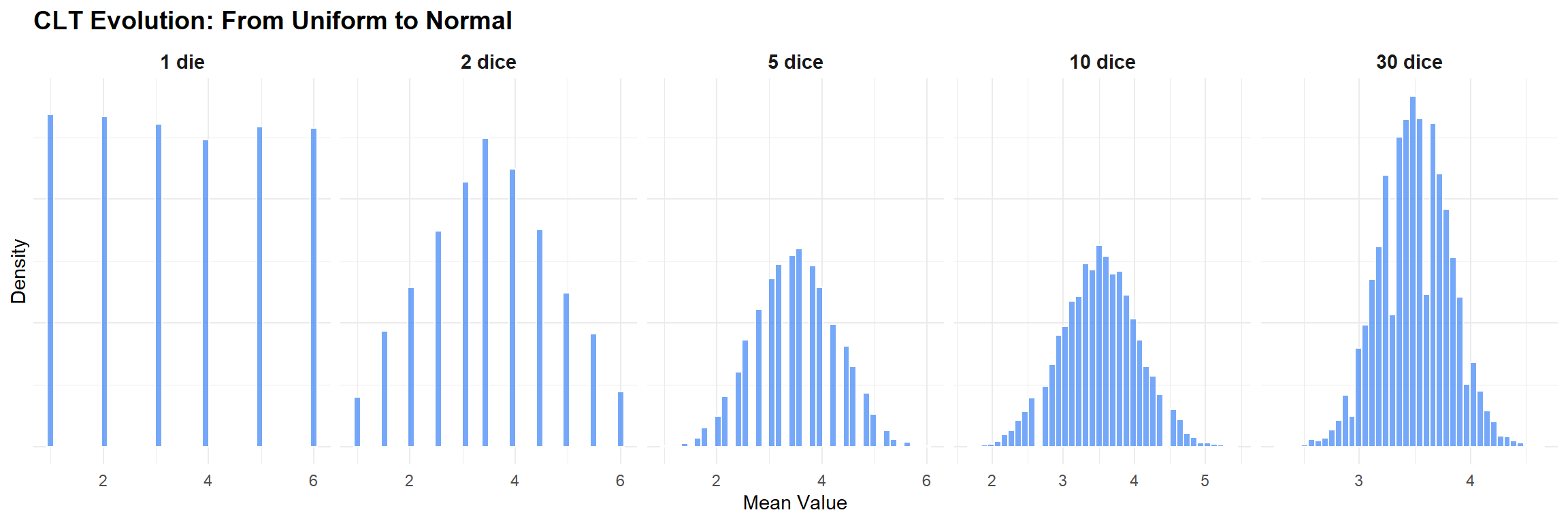 Essential Property of CLT: Although individual die rolls follow a uniform distribution, the distribution of means from multiple dice converges asymptotically to a normal distribution in a predictable manner consistent with mathematical theory, providing the foundation for classical statistical inference.