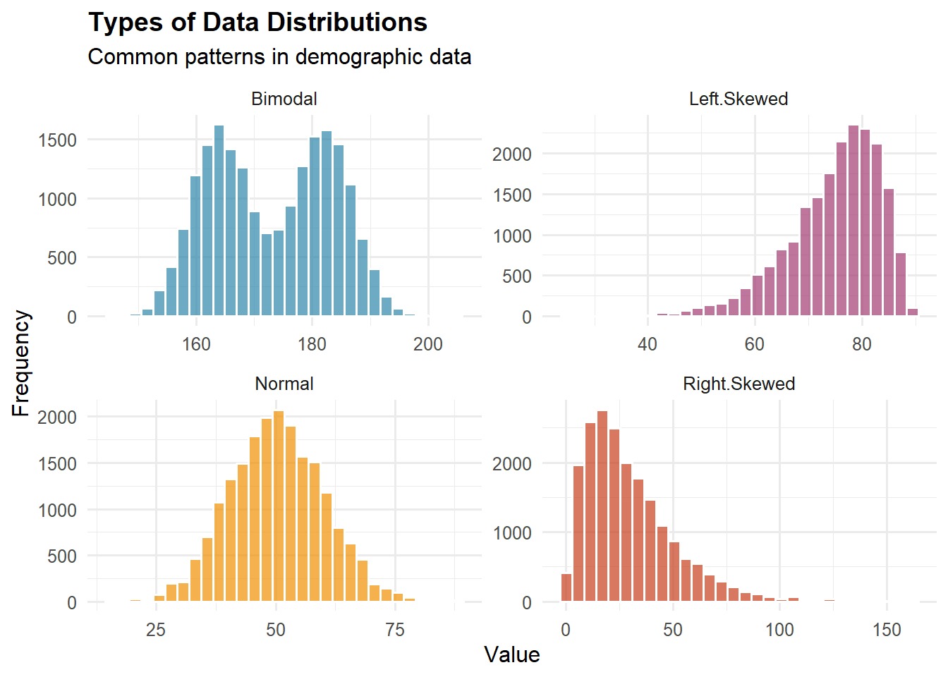 A data distribution describes how values spread across possible outcomes (what values and how often a variable takes). Distributions tell us what values are common, what values are rare, and what patterns exist in our data.
