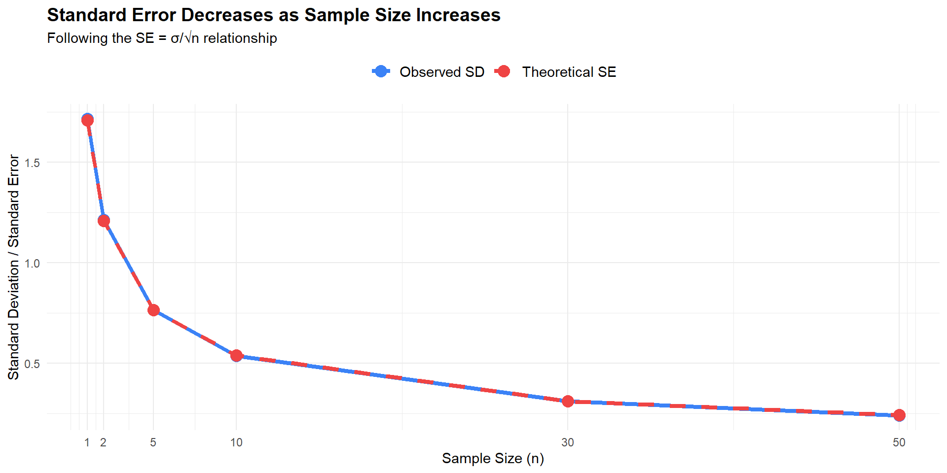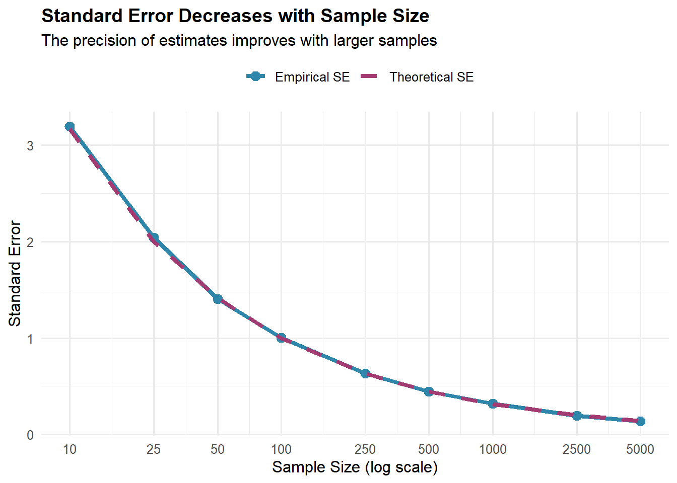 The standard error exhibits systematic decline as n increases (SE ∝ 1/√n)