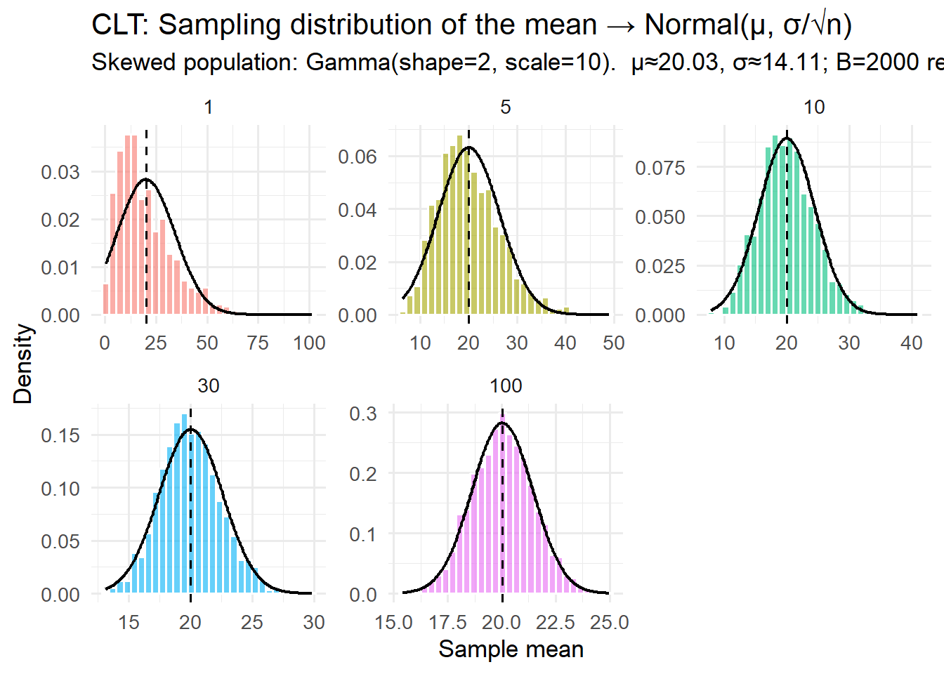 Convergence to Normality: At n=30, a distinct normal distribution is observable
