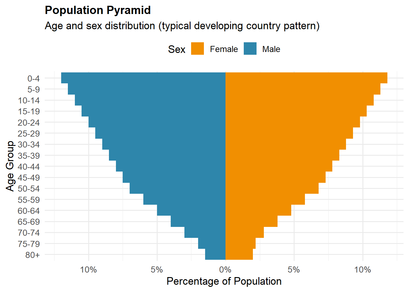 Population Pyramids: Show how many people are in each age group, split by males and females. Helps you see if a population is young or old.