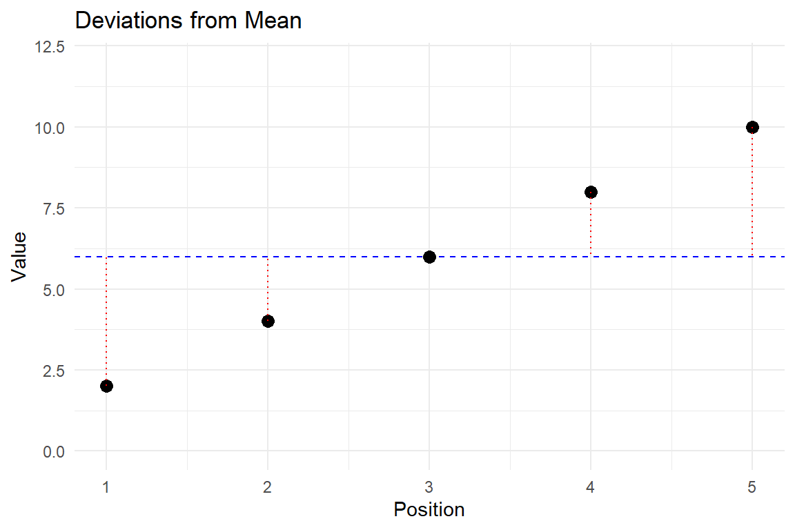 Important observation: The sum of deviations from the mean always equals 0, which is a fundamental property of the arithmetic mean.