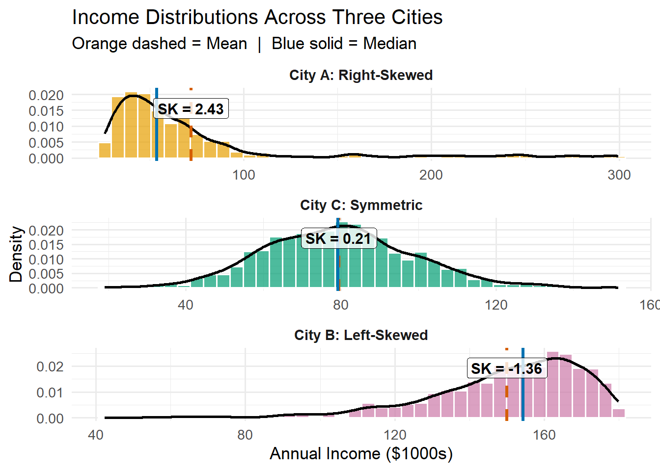 Skewed distributions are asymmetric, with one tail longer than the other.