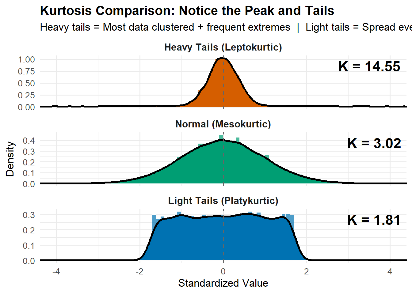 # Generate right-skewed dataright_skewed <-data.frame(x =rlnorm(1000))# Plotggplot(right_skewed, aes(x)) +geom_histogram(aes(y = ..density..), bins =30, fill ="lightyellow", color ="black") +geom_density(color ="red") +labs(title ="Right-Skewed Distribution", x ="Value", y ="Density")