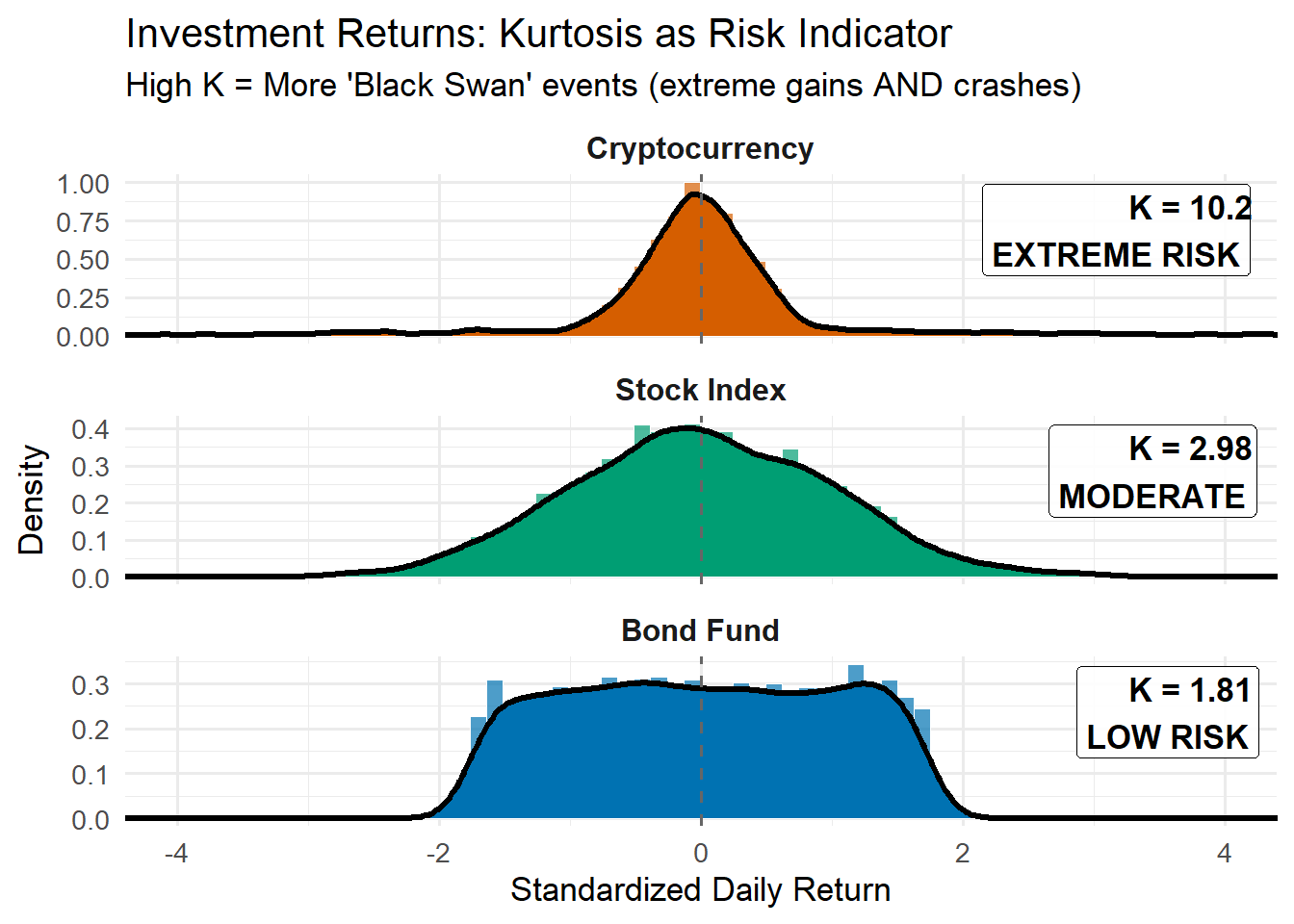 # Generate bimodal databimodal_data <-data.frame(x =c(rnorm(500, mean =-2), rnorm(500, mean =2)))# Plotggplot(bimodal_data, aes(x)) +geom_histogram(aes(y = ..density..), bins =30, fill ="lightpink", color ="black") +geom_density(color ="red") +labs(title ="Bimodal Distribution", x ="Value", y ="Density")