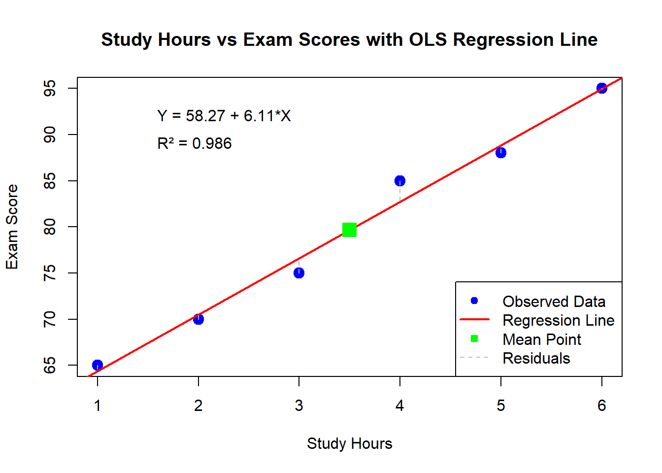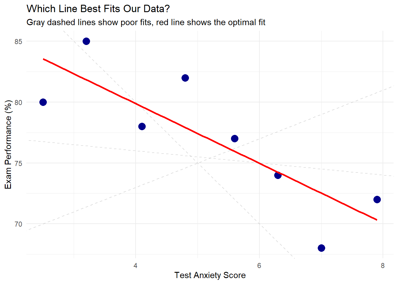 When you plot this data, you get a scatter plot with dots all over. Your goal: find the straight line that best describes the relationship between study hours and exam scores.