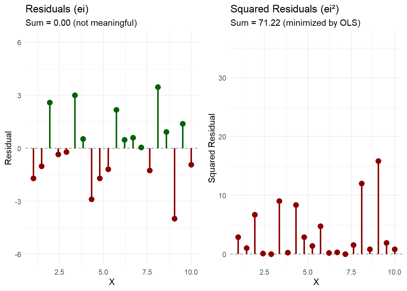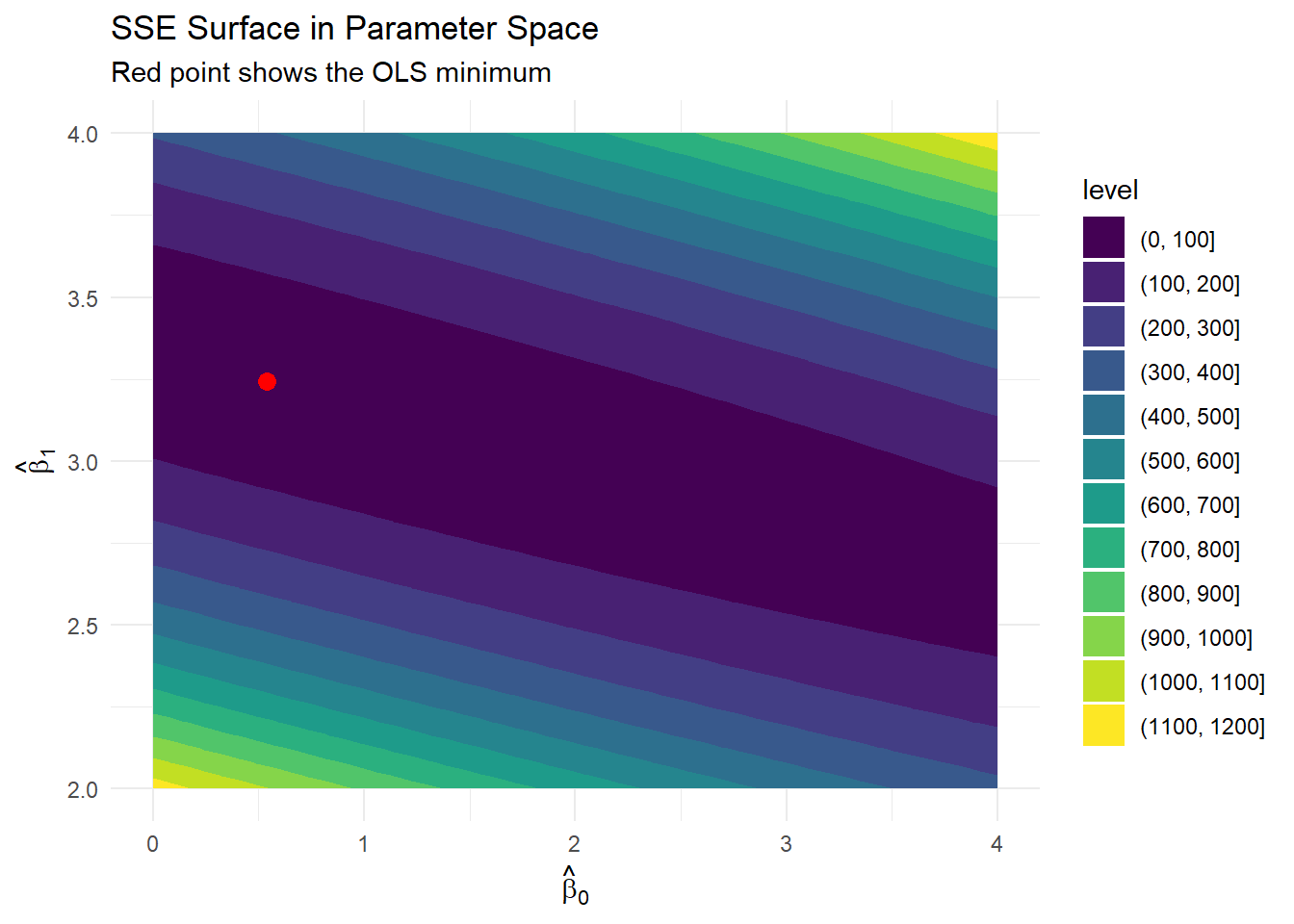 The “best” line is the one that minimizes SSE. Using calculus (taking derivatives with respect to \beta_0 and \beta_1 and setting them to zero), we get the OLS formulas.