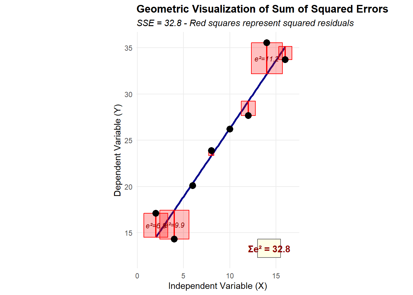 The Sum of Squared Errors is: SSE = \sum_{i=1}^{n}(Y_i - \hat{Y_i})^2 = \sum_{i=1}^{n}(Y_i - (\beta_0 + \beta_1 X_i))^2