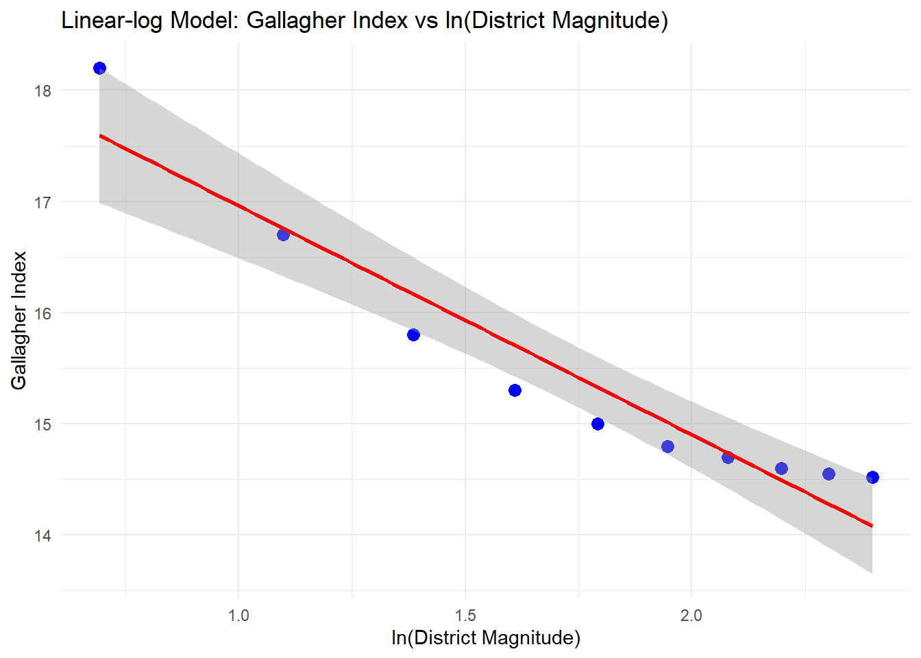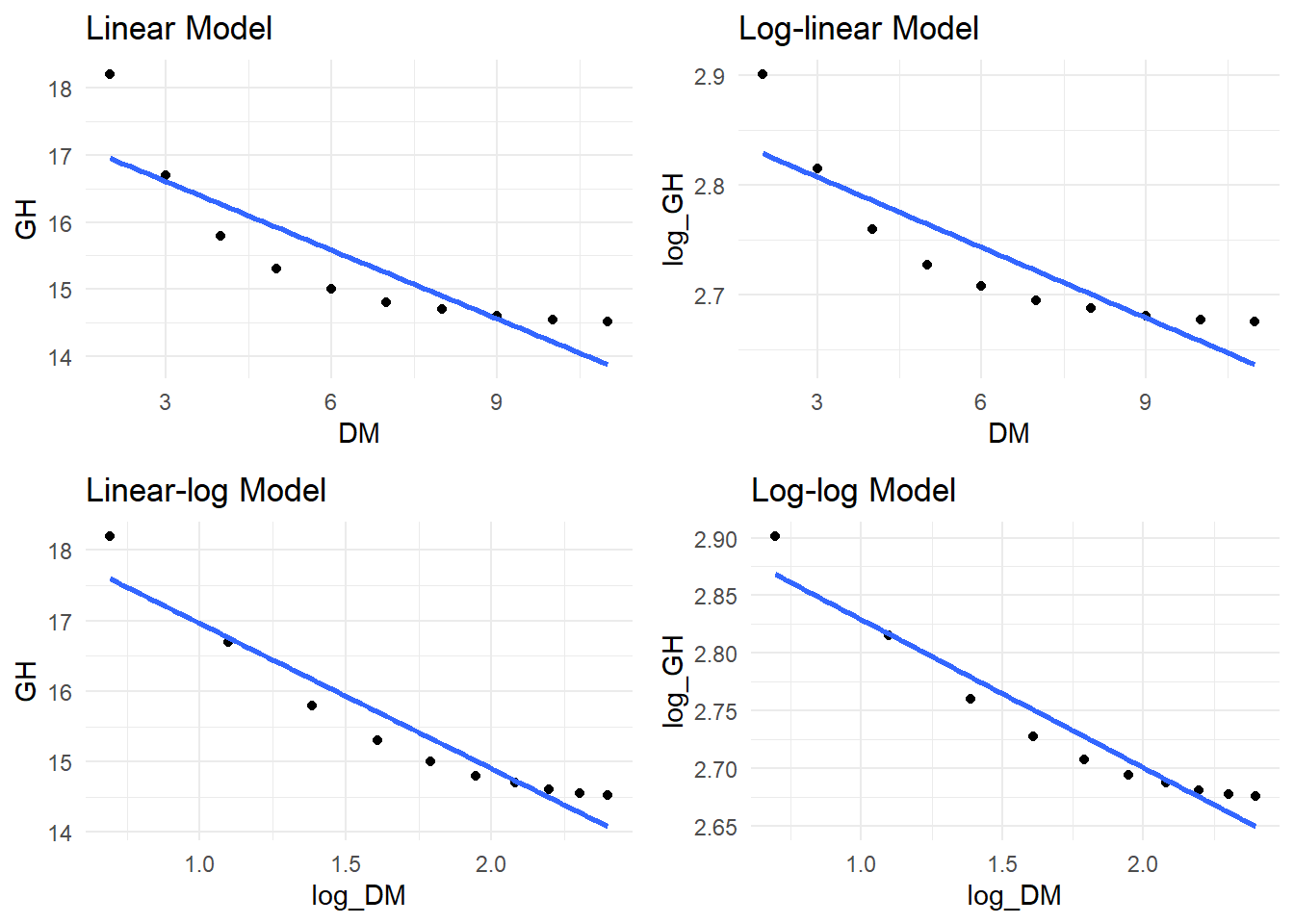 The slope coefficient \hat{\beta_1} = -2.451 is our effect size. It tells us: