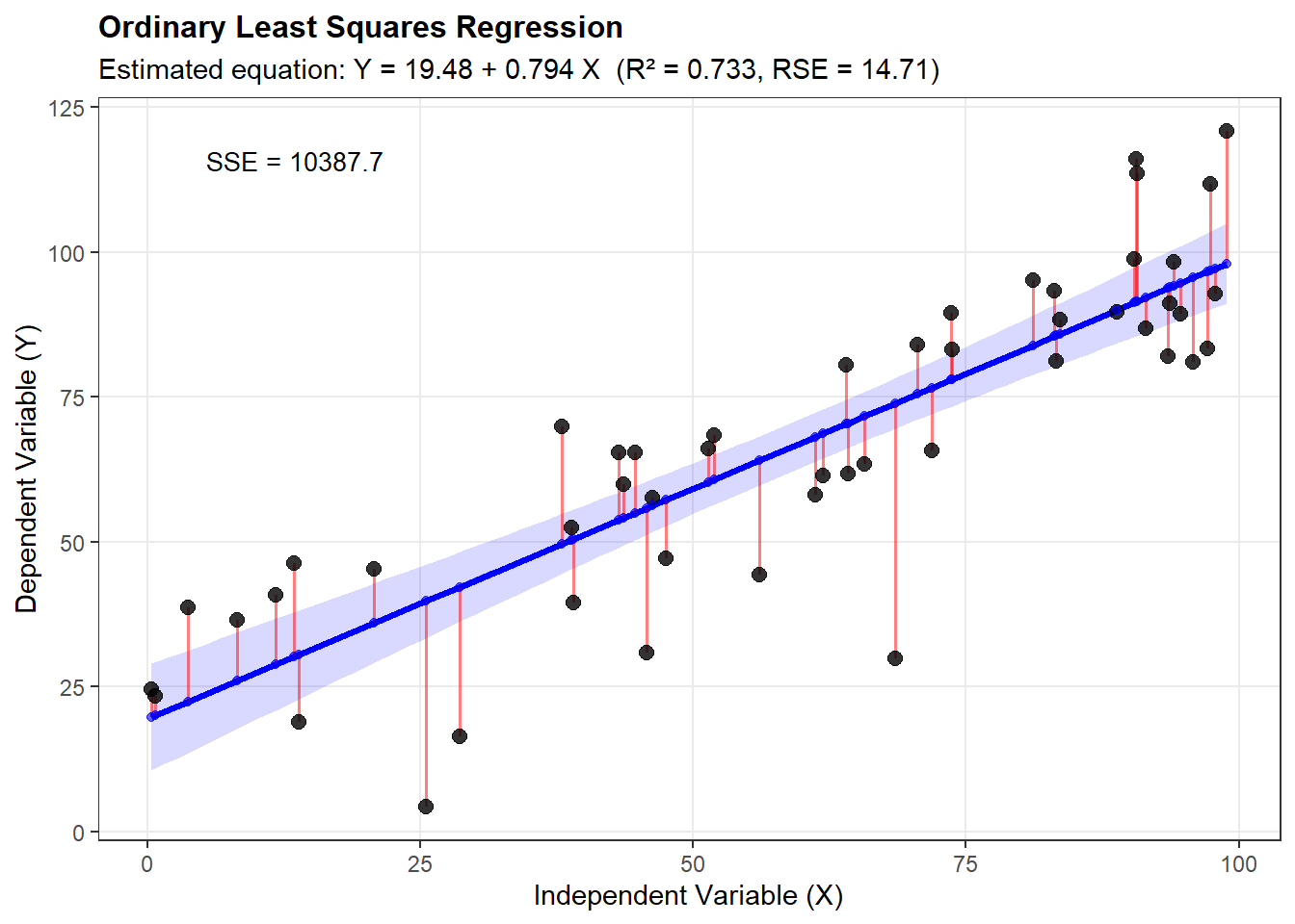 The Ordinary Least Squares (OLS) method finds the values of \beta_0 and \beta_1 that minimize SSE: