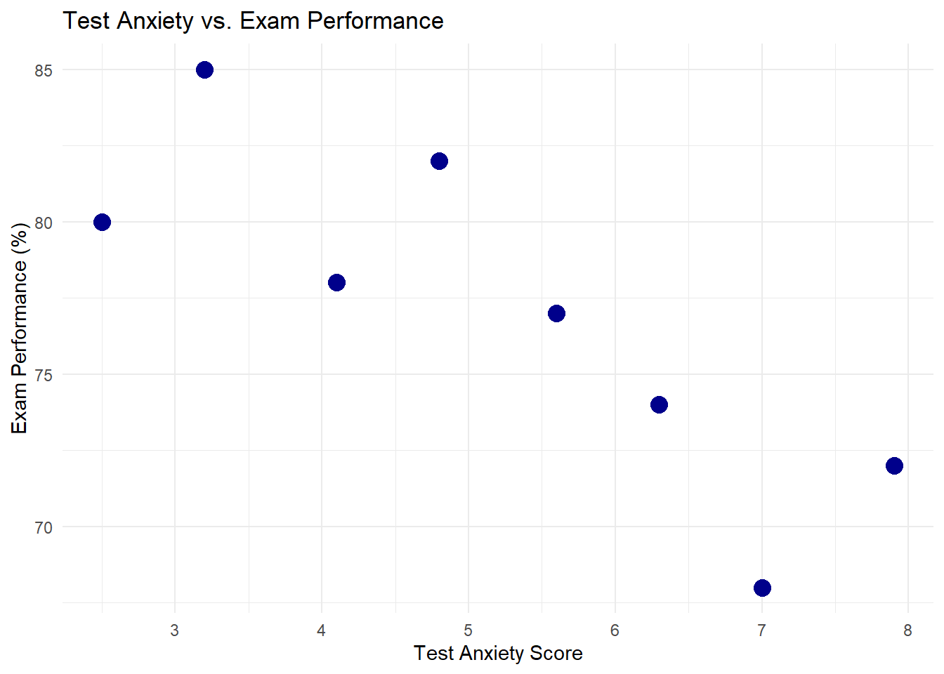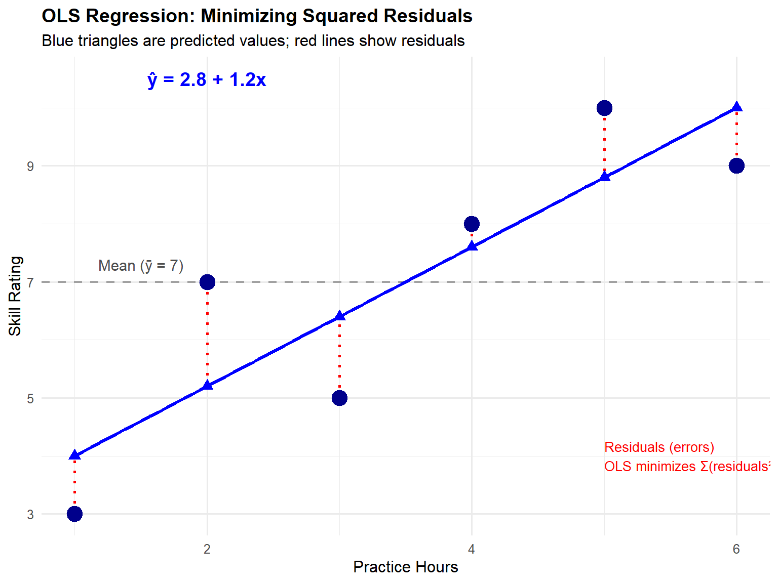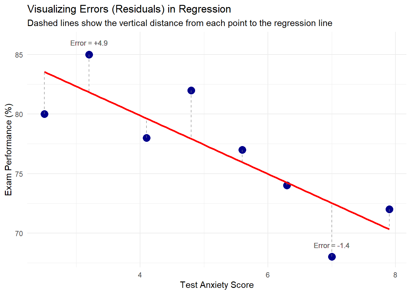 # Create comprehensive plotggplot(data.frame(anxiety, performance), aes(x = anxiety, y = performance)) +geom_point(size =4, color ="darkblue") +geom_smooth(method ="lm", se =FALSE, color ="red", linewidth =1) +geom_text(aes(label =paste0("(", round(anxiety, 1), ", ", performance, ")")),vjust =-1, size =3) +annotate("text", x =3, y =70, label =paste0("ŷ = ", round(coef(model)[1], 2), " - ", abs(round(coef(model)[2], 2)), "x"),size =5, color ="red") +labs(title ="Regression Line: Performance vs. Anxiety",subtitle ="Higher anxiety is associated with lower exam performance",x ="Test Anxiety Score",y ="Exam Performance (%)" ) +theme_minimal() +scale_x_continuous(breaks =seq(2, 8, 1)) +scale_y_continuous(breaks =seq(65, 90, 5))