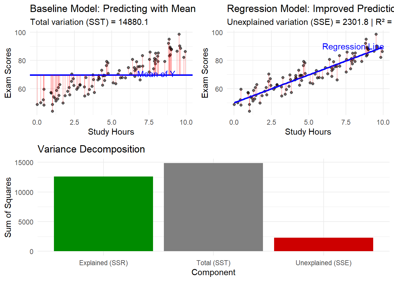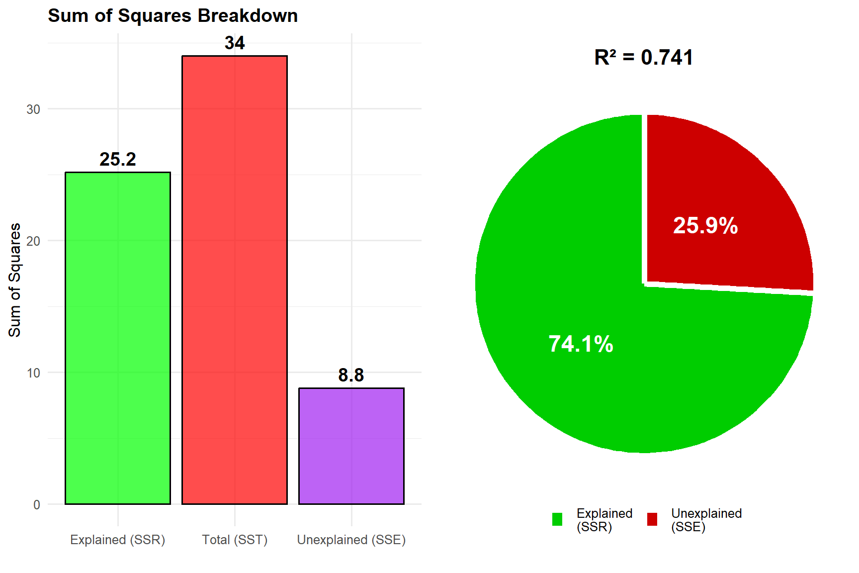 This decomposition lets us calculate R-squared (R²), which is simply: R^2 = \frac{SSR}{SST} = \frac{\text{Explained Variation}}{\text{Total Variation}}