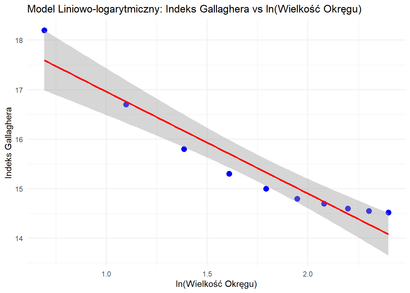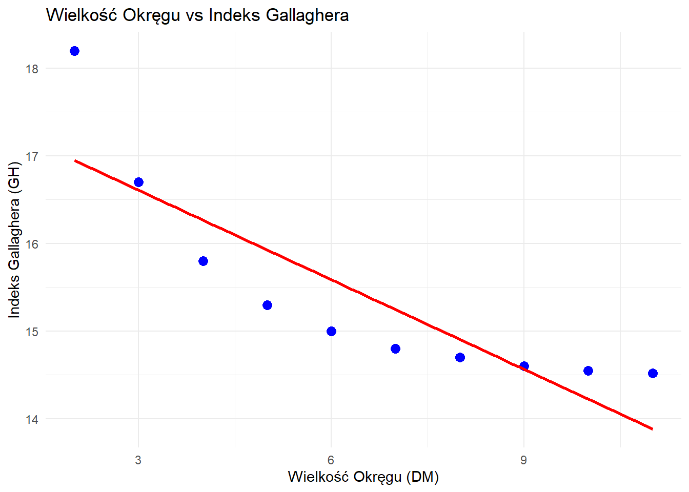 Równanie regresji: Dla każdego jednostkowego wzrostu wielkości okręgu, wskaźnik dysproporcjonalności LH zmniejsza się o 0.974 jednostki. Wyraz wolny (16.511) reprezentuje oczekiwany wskaźnik LH, gdy wielkość okręgu wynosi zero (choć nie ma to praktycznego znaczenia, ponieważ wielkość okręgu nie może wynosić zero).