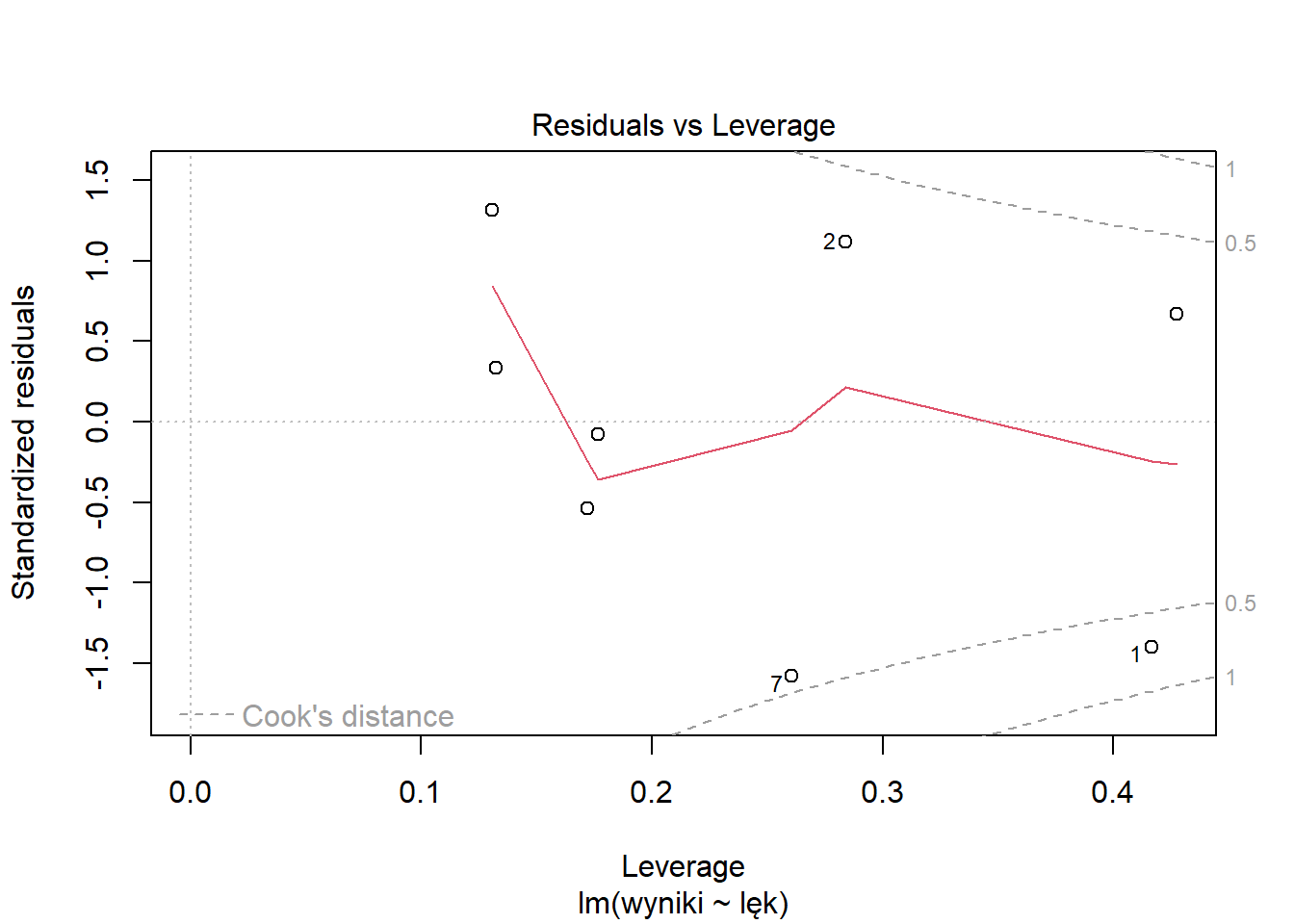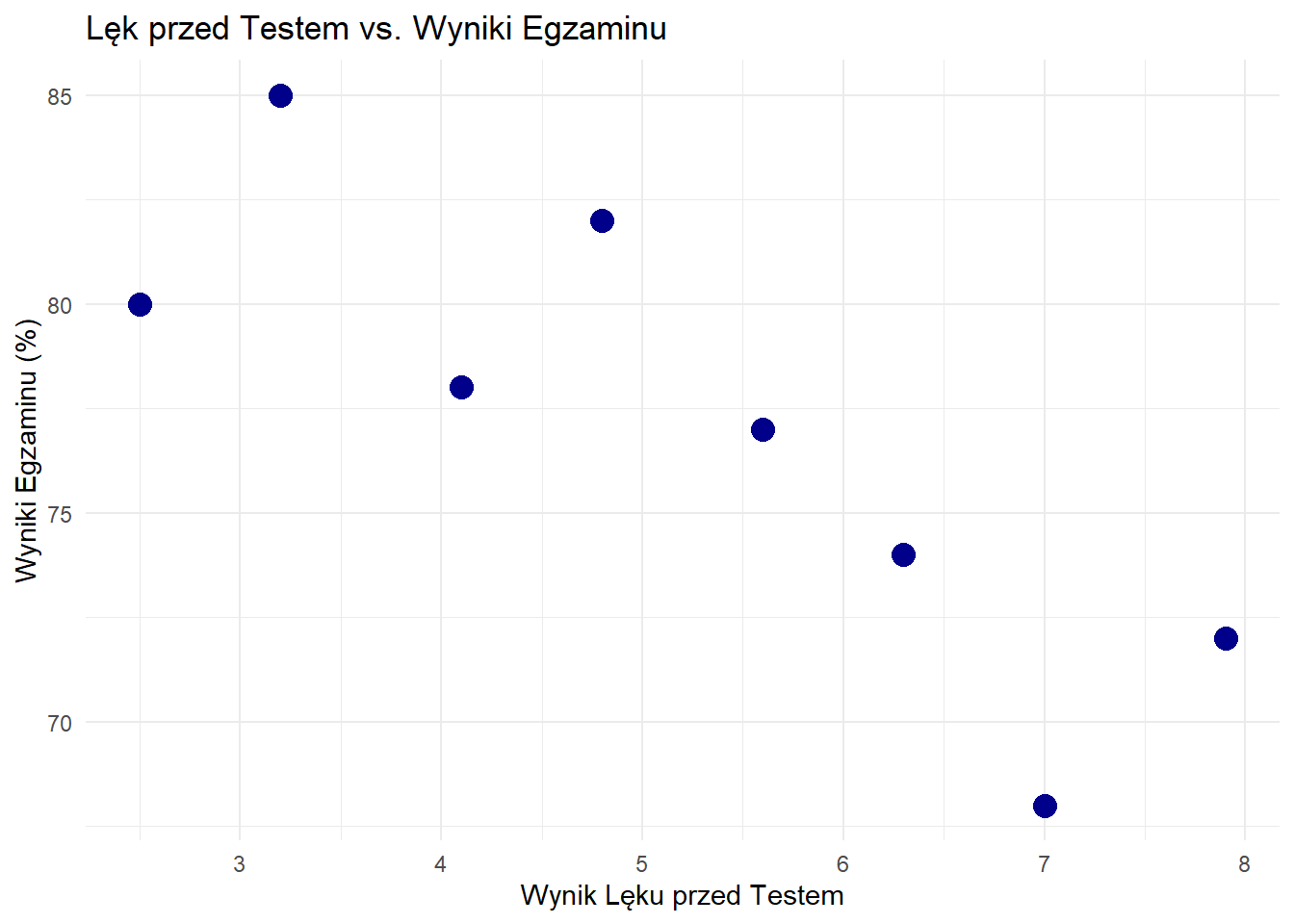 # Nasze danelęk <-c(2.5, 3.2, 4.1, 4.8, 5.6, 6.3, 7.0, 7.9) # Wyniki lękuwyniki <-c(80, 85, 78, 82, 77, 74, 68, 72) # Wyniki egzaminu (%)# Stworzenie ramki danych dla łatwego przeglądudane <-data.frame(Student =1:8, Lęk = lęk,Wyniki = wyniki)print(dane)