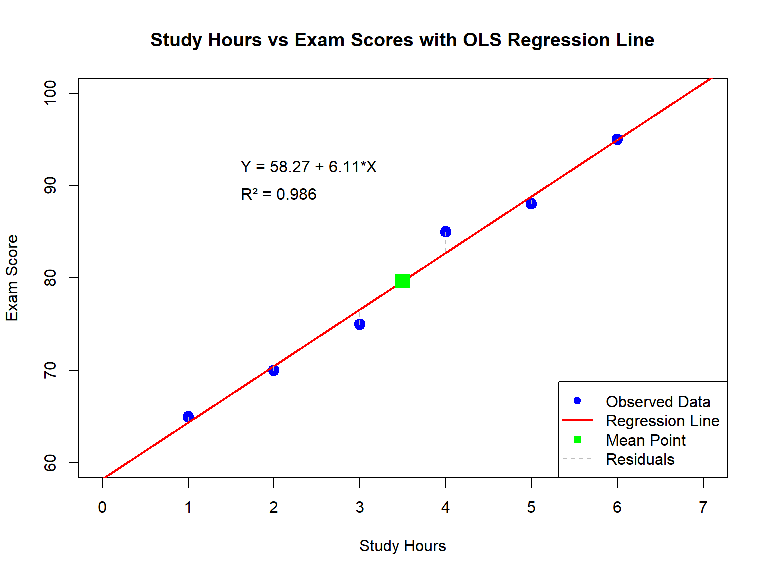 Po narysowaniu wykresu punktowego (scatter plot) chcesz znaleźć prostą, która najlepiej opisuje związek między godzinami nauki a wynikiem.